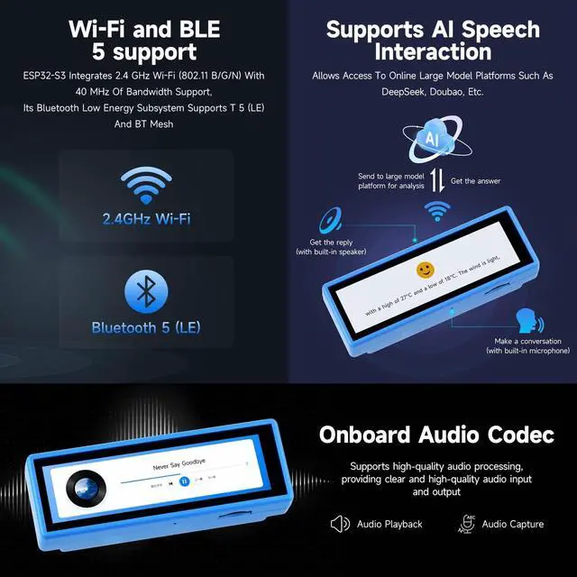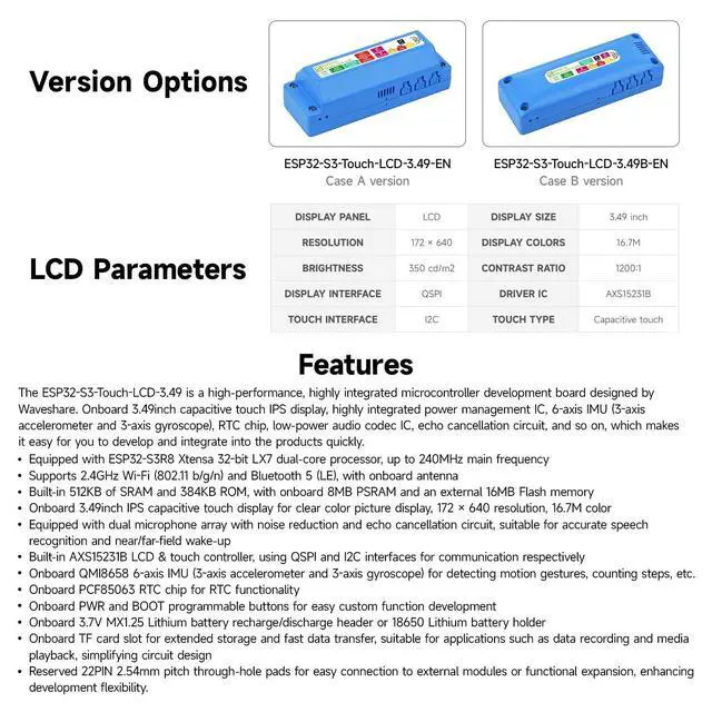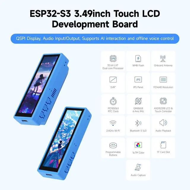 It features a premium 3.49 -inch capacitive touch IPS display with a sharp 172 x 640 resolution for clear, colorful visuals. Dual digital microphones with noise cancellation support accurate voice recognition for both near and far-field wake-word applications. ^^ With substantial built-in memory (512KB Static Ram, 384KB ROM) supplemented by 8MB PStatic Ram and 16MB external Flash, it handles complex tasks with ease. An onboard Micro SD card slot provides flexible storage expansion for data logging and media playback. ^^ The board includes a QMI8658 6-axis IMU (3-axis accelerometer + 3-axis gyroscope) for motion sensing and a PCF85063 RTC chip for precise timekeeping, making it ideal for portable and time-sensitive applications.