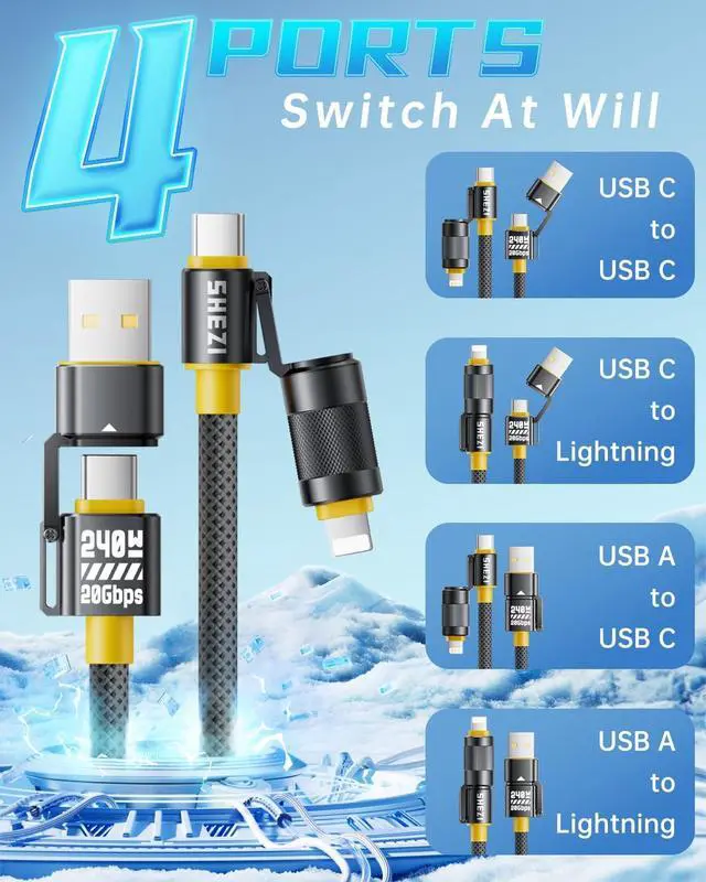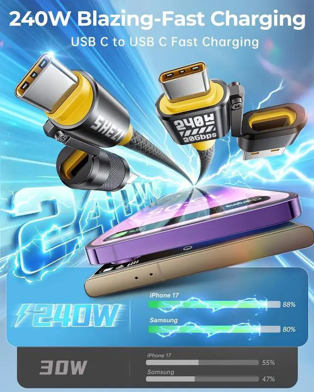 [4-in-1 Multi Charging Cord for All Devices] Simplify your charging setup with our versatile 4-in-1 usb-c cable. It combines 4 ports, USB-C to L, USB-C to USB-C, USB-A to USB-C and USB-A to L. Providing a comprehensive solution for your fast charging and data transfer needs. ^^ [240W Fast Charging Speed] This 240W iphone 17 USB-C to USB-C cable supports PD 3.0 fast charging, it can fast charge your Macbook Pro and iPhone 17/17 Air/iPhone 17 Pro Max, giving you a quick and convenient way to charge your devices up to 80% in 30 minutes.