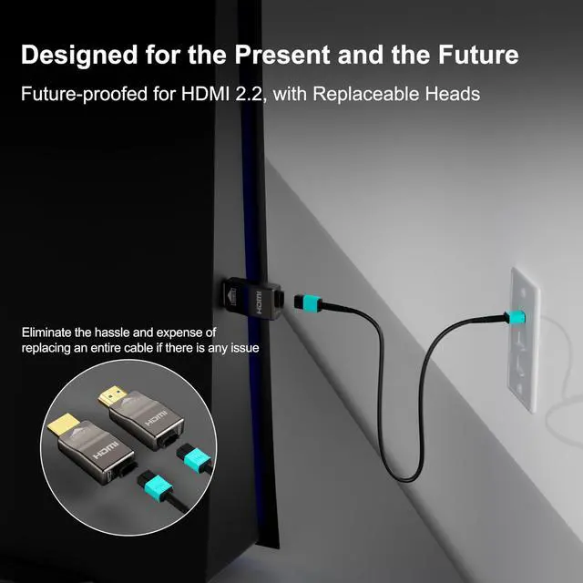 Detachable Connectors: Detachable Fiber Optic HDMI cables eliminate the hassle and expense of replacing an entire cable if there is an error in the installation process, a connector failure, or the connector ends get damaged. This is especially important if the cable is installed in-wall. It's also easier to upgrade with replaceable heads, future-proofed for HDMI 2.2 ^^ Full Fiber Optic Armored