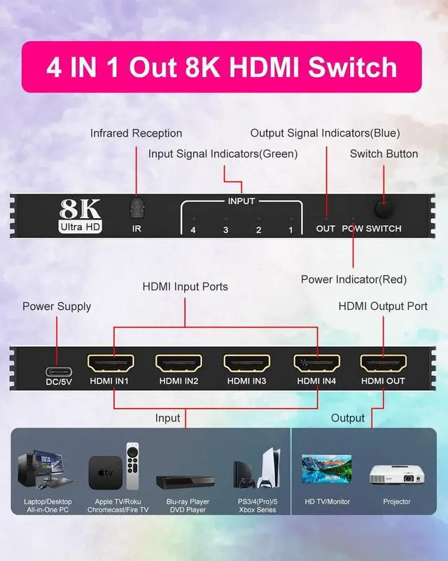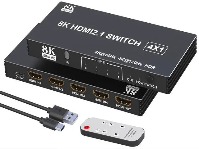 HDMI Switcher: Easily connect up to 4 HDMI devices to a single monitor or TV, eliminating the need for constant cable swapping. With a dedicated remote and manual button, switching between sources is seamlessperfect for gaming setups, home theaters, and workstations ^^ Next-Gen 8K