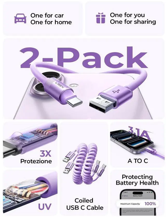 LISEN Coiled USB C Cable, 2 Pack for Android Auto & CarPlay Cable, Short USB A to USB C Cable Compatible with iPhone 17/16/15, Samsung Galaxy S25/S24/S23 A15/A14, Google Pixel 9/8, Purple 4FT