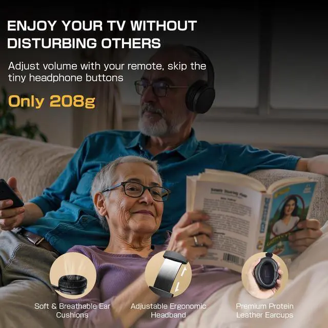 Note: Please ensure your TVs corresponding port is an AUDIO OUTPUT PORT for proper functionality. ^^ Stable Connection with AptX Low LatencyEnjoy flawless audio-video synchronization with advanced Bluetooth 5.2 and aptX Low Latency (<40ms) technology. The built-in F-Antenna ensures a strong, stable connection that penetrates walls, providing reliable coverage up to 100 feet. No manual pairing is ever neededthe headset and transmitter connect automatically for instant, uninterrupted viewing as you move around your home. ^^ All-Day Comfort & 20-Hour BatteryWeighing a mere 208g, these TV headphones are built for marathon viewing sessions. The soft protein leather earcups and breathable mesh provide cloud-like softness, while the adjustable, retractable headband ergonomically fits the shape of your headideal even for those who wear glasses. Powered by a 500mAh battery, they deliver up to 20 hours of continuous use on just a 23 hour charge, perfect for long viewing sessions without power anxiety. ^^ Powerful, High-Volume Sound for the Hearing ImpairedEngineered with a large 40mm driver and high sensitivity, these headphones deliver loud, crystal-clear audio without distortion. They are specifically designed to assist those with hearing challenges, ensuring every dialogue, news report, and movie soundtrack is heard vividly and at ample volume for a truly immersive experience.