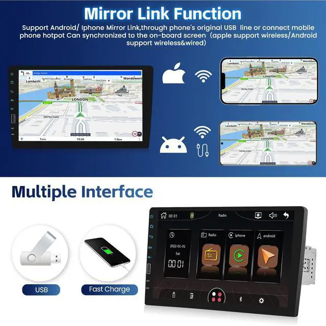 Features: 9-inch IPS touch screenSame screen functionWireless/Wired Carplay Android autoYouTube video playbackFM/AM/RDS RadioBluetoothEQ Sound EffectsUSB interfaceSteering Wheel ControlBackup CameraColorful