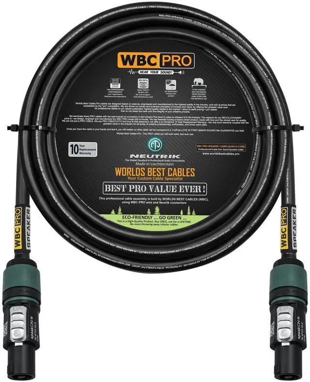 These high-value, high-quality cables will not break your bank and the integrity of your creative process. With WBC-PRO you are buying a product made with love and the utmost care for quality. WBC-PRO, the only cable you will ever need! ^^ The brand of connector used for this cable assembly: NL4FXX-W-S is the latest & the highest-end four-pole SpeakON offering by Neutrik AG- Liechtenstein, the world's leading brand for professional audio connectors. It sports a reliable twist-locking system, thermoplastic housing & Silver-plated Copper-alloy connectors. Offering the most reliable loudspeaker connections, the plugs can support 6mm to 12mm wide cables & have an IP20 rating. ^^ All our cables are professionally soldered using WORLDS BEST CABLES proprietary 4% silver solder blend & a nitrogen-assisted soldering process unique to us, exceeding industry standards, improves integrity of solder joints over traditional methods. ^^ These cables are lovingly assembled by WORLDS BEST CABLES, we offer the largest array of custom-built cables in the market, we carry all the major cable and connector brands. We have served millions of customers with quality assemblies for many years - this sale is for a single 10 Foot long cable.