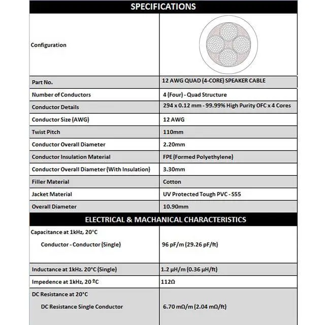 WBC-PRO-SPEAKER-12AWG, Star-Quad (eliminates EMI noise), Ultra-flexible, Professional-grade cable is a top-of-the-line solution for super-durable speaker cables. Low Capacitance & Resistance are ideal for long cable runs while still delivering Higher-Highs and Deeper-Lows. The cable sports 294 x 0.12 mm High-Purity ( 99.99 %) Oxygen Free Copper (OFC) Strands per Core. Suitable for even the most demanding situations (UV Protected Tough PVC Jacket) & superior to Industry leaders like Canare 4S11. ^^ WBC-PRO cables are designed based on science, engineered & manufactured in-house to the highest quality in the industry, and sold at prices that are unbeatable by the pro competition.