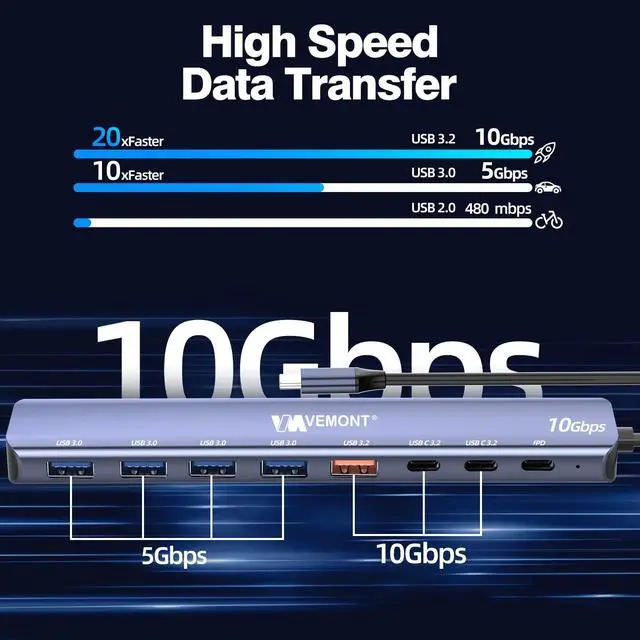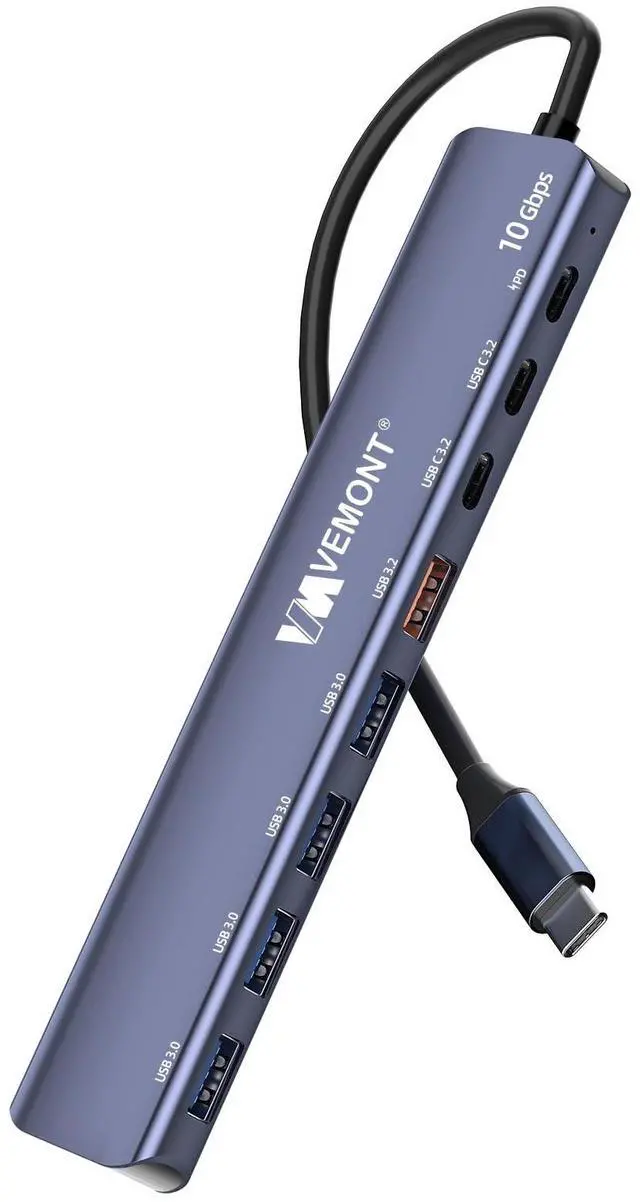7 in 1 USB C HubThe usb 3.2 hub can instantly turn 1 USB C port into 2 USB-C 3.1 Gen2 ports, 1 USB-A 3.1 Gen2 port, 4 USB-A 3.0 ports and 1 100W PD charging port. Support plug and play, no driver required, easy to help you solve the problem of insufficient ports, allowing you to connect multiple USB A/C devices at the same time. ^^ 10Gbps SuperSpeed TransferThe VEMONT 7 ports USB hub with 2*USB C 3.2 ports, 1*USB A 3.2 port and 4 x USB 3.0 ports, provide file transfer at speeds up to 10Gbps.