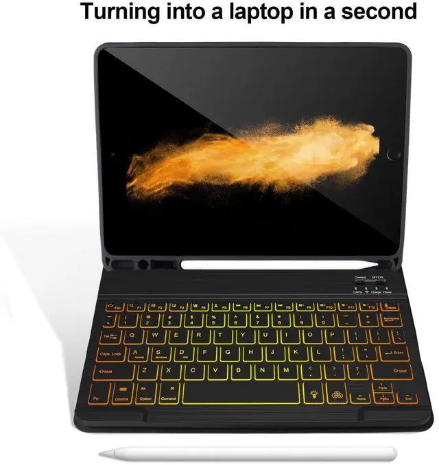 Number: A1701/A1709). Please check your iPad model before purchasing! ^^ Detachable Wireless Bluetooth Keyboard for iPad 10.2 inchAfter this keyboard is connected to your iPad 9/8/7th generation via Bluetooth once, it will automatically connect after subsequent use, turning your iPad into a laptop in seconds! It supports carrying around, which is convenient for entertainment and office. The scissor-style mechanical keyboard feels quiet and smooth, providing you with a comfortable typing experience. ^^ Powerful Battery &Built-in Pencil HolderBuilt-in Strong battery with energy-saving mode, it only takes 2-3 hours to fully charge, work at least 80 hours and stand by for 30+ days. The inner layer of the case is padded with a honeycomb grid, which releases 80% more heat than other iPad cases, preventing overheating to prolong the life of your iPad 9/8/7th Gen, iPad Air 3rd, iPad Pro 10.5 '' Tablet. Built-in Apple Pencil holder, cap and adapter slot, grab your Apple Pencil for easy portability and use. ^^ Multiple angles Stand &Magnetic CaseThis iPad 9th generation case with keyboard adopts clamshell magnet detachment design, can support three different angles of standing, providing