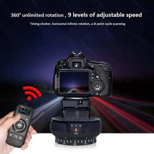 1. Mcoplus YT-1200 360-degree rotation Intelligent Remote Control Pan Tilt Head, Compatible for Cameras/Smartphones (Limited Weight Under 1kg ). Automatic Motorized Rotating Panoramic Head adoptstechnology, It has 99 remote control channels, strong anti-interferencea bility, The remote control distance can reach within 100 meters of line-of-sight. The weight of the PTZ is 518g. ^^ 2. Wireless Multi-function Remote Control, included 2AAA batteries with a Shutter Release Button, which can control the 360-degree rotation of the gimbal and other operations to achieve panoramic and various angle shooting. The remote control adopts an OLED LCD Screen; The remote control have 5 MODES Horizontal &Vertical ROTATION SPEED have 9 LEVELS adjustable.