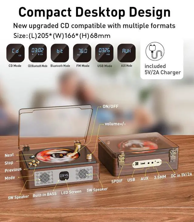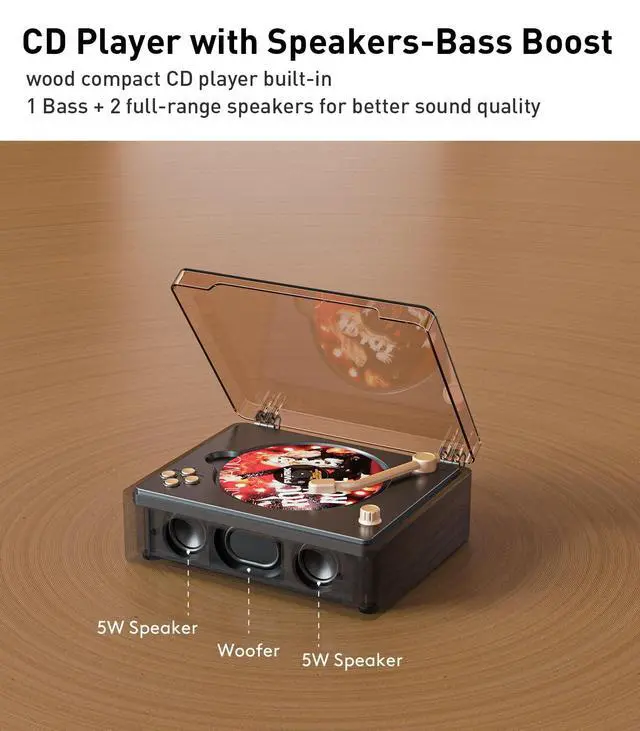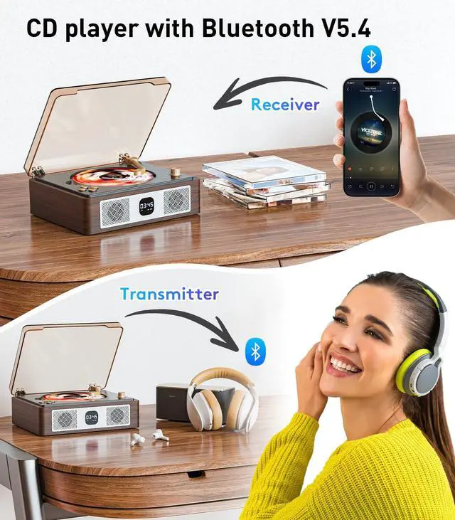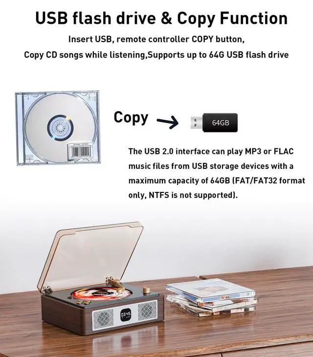 Transmit: In CD mode, use the remote control to turn on Bluetooth transmit to connect to a wireless headset/Bluetooth speaker, and the CD player can be used as a wireless speaker to receive Bluetooth signals from a cell phone/tablet/laptop ^^ A vintage CD player with USB ripping support! You can save your favorite CDs in MP3 format to a removable storage device (you need to plug in a USB memory to record to a USB memory device while playing CDs) ^^ USB