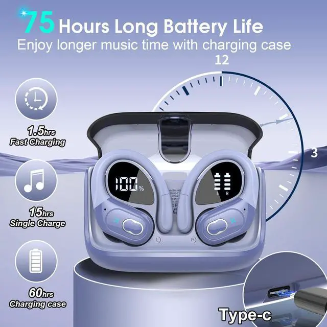 Dual LED Display: Running headphones provides up to 15 hours continuous using time on a single charge, portable charging case can charge the earbuds for 5-6 times, giving 75 hours of a total playtime. Whether on the road or in daily life, it will provide unparalleled convenience and smart experience. The dual LED display on earphones accurately display the remaining power of charging case and the charging progress of Wireless ear buds. ^^ Hi-Fi Deep Bass Stereo and
