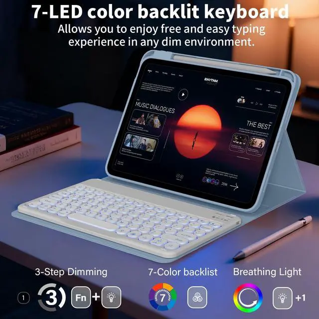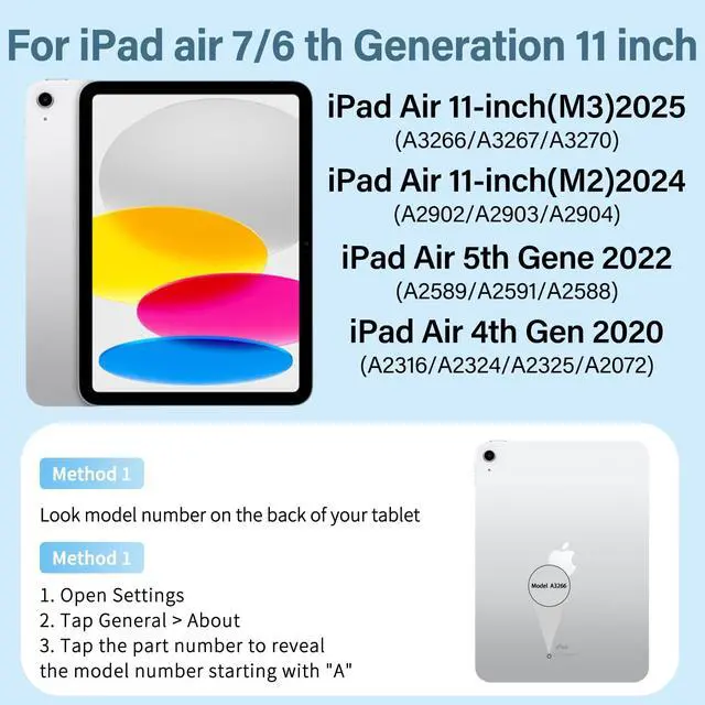 Generation 10.9 inch 2020 (Model: A2072/A2316/A2324/A2325). NOT compatible with any other iPad models. Please check the back bottom of your iPad carefully to find the Model Number before purchase ^^ Magnetic Detachable Bluetooth KeyboardThis iPad air 11-inch M4/M3/M2 (2026/2025/2024) with Keyboard Case comes with a magnetic detachable lightweight Bluetooth keyboard. The iPad air 10.9 inch (2022/2020) wireless keyboard pairs quickly with your tablet via a BT connection and attaches securely to the case via magnetism, instantly turning your tablet into a portable laptop, perfect for working, typing, editing, or watching videos, dramatically increasing the productivity of your iPad ^^ Built-in Pencil Holder & Quality MaterialsBuilt-in pencil holder, storage and charging in one. The pencil holder is set on the right side of the protective case, easy to put in and take out the pencil, so you will never lose your pencil again.