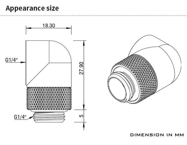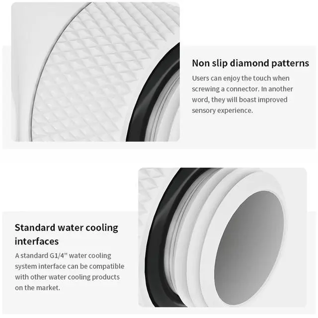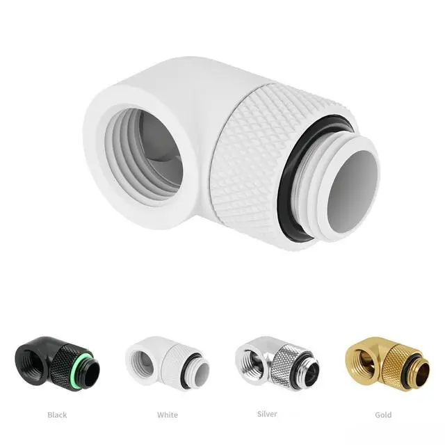 90 Angle 360 RotaryExtenal connector featuring a fixed 90 angled elbow and 360 rotation capability for precise alignment adjustments and easy installation. Ensures quick, secure connections with simple tightening. ^^ Leak-ProofBuilt-in silicone O-ring, rotary adapter ensures reliable sealing, effectively prevents coolant leakage, and maintains safe and stable operation of the water cooling system for extended periods. ^^ Universal ThreadWith G1/4" male-to-female thread design, it offers broad compatibility with metal, PETG and rigid tubing. It is suitable for connections between components in PC water cooling systems such as block, radiators, and water pumps etc.