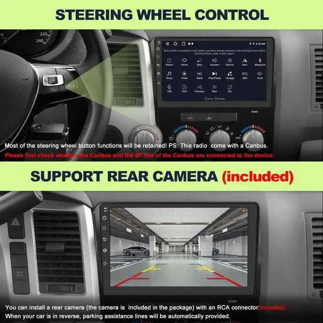 Control Compatibility: You can answer calls, switch tracks, or adjust the volume using your car's original steering wheel buttons. If your vehicle requires a CANBUS connection, please note that the power cable harness in the package must be properly connected to both the CANBUS and the 8-pin port on the back of the radio. Otherwise, the steering wheel control function may not work correctly.