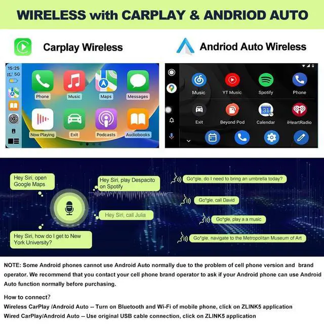CarPlay/Android Auto Wireless/MirrorLink: You can activate iOS CarPlay or Android Auto via a wired or wireless connection. With built-in voice recognition like Siri or Go0gle Assistant, you can control navigation apps, music, messages, and calls directly from the screen without touching the device.