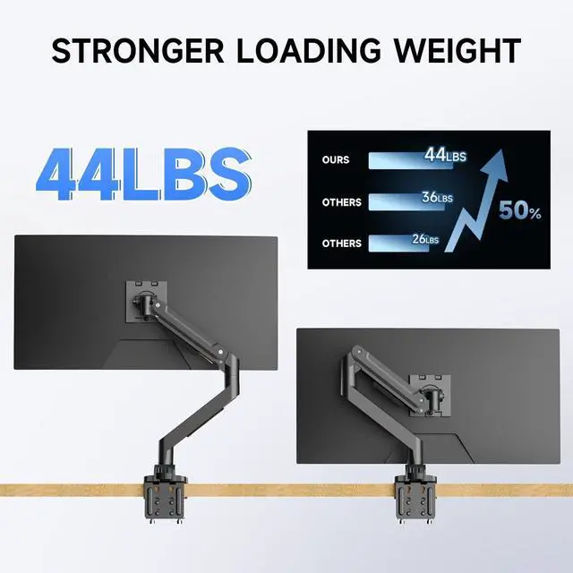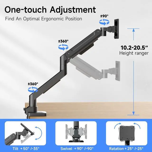 Full Motion: Easily customize your viewing angle with our single monitor arm. Tilt +50/-35 up and down, swivel 90, and 360 rotation allow you to adjust the monitor for optimal ergonomic comfort and reduce neck strain & eye fatigue ^^ Two