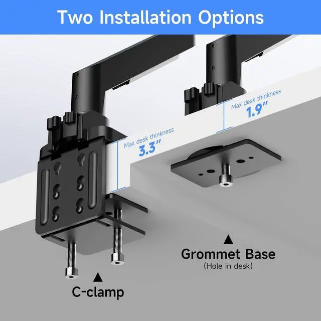 Mounting Options: This sturdy desk clamp provides superior support and is equipped with an equally secure grommet base that fits desk up to 3.46" thickness, accommodating a variety of desk layouts while saving your valuable desk space ^^