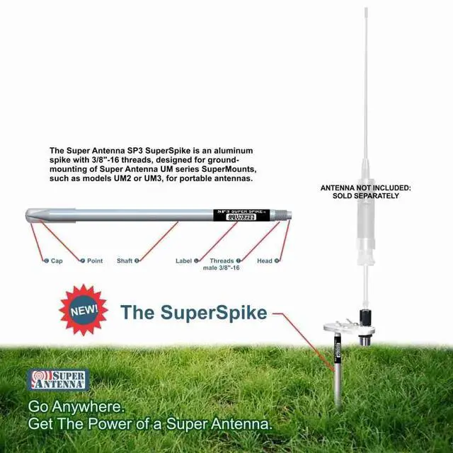 Get The Power Of A SuperAntenna. The model Um3sp SuperMount Ground Spike Mount for Portable Antennas, by Super Antenna. For Vertical configuration. Whether your antenna support needs are a DXpedition, air travel, backpacking, backyard, weekend get-away, field day, or an EmComm disaster relief antenna set up... be prepared for any type of rapid deployment in any environment. So many top operators choose the SuperMount because it is extremely lightweight, compact, rugged, and versatile. It enables the antenna to be mounted directly on a lawn or soft earthen ground.