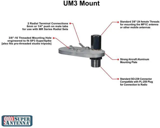 Compatible with HAM or CB, any mobile or portable antenna with a 3/8"-24 thread fitting works with it. EmComm - Portable - Base - Backpack - Survivalist - Prepper - Pedestrian. Get the UM3SP SuperMount, for a big signal in a small package.