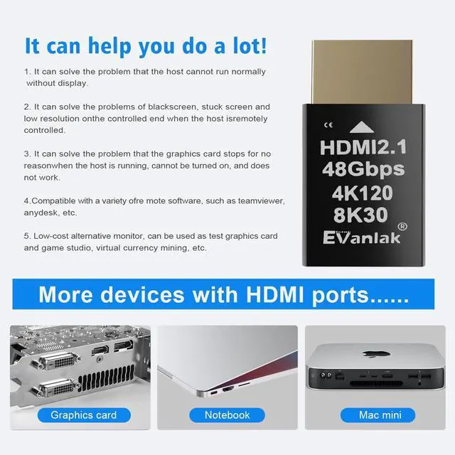 (Note: Your graphics card must support HDMI 2.1 to achieve 4K/120Hz refresh rate. ) ^^ Transform your computer into a headless system with a cost-effective solution that eliminates the need for expensive real monitors. Ideal for saving energy and reducing environmental impact, this device is perfect for use in server farms, home office setups, and remote headless PCs.