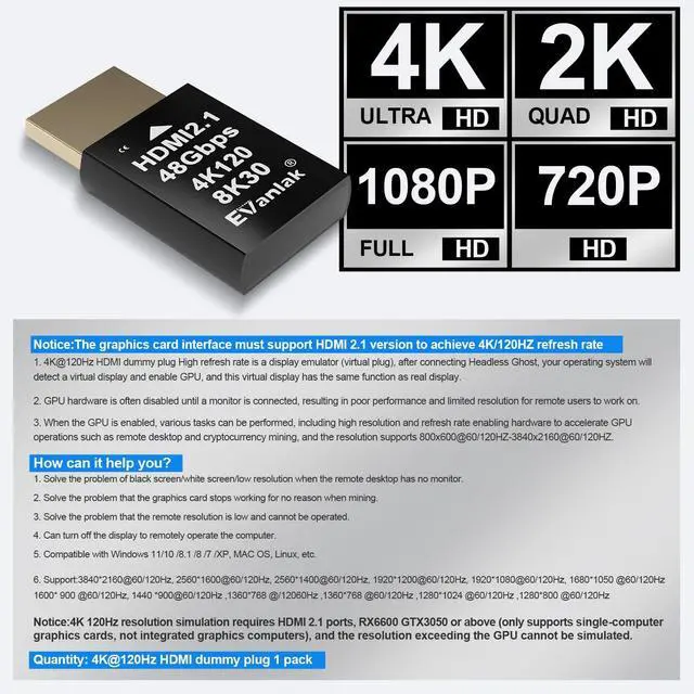 Function: The 4K@120Hz HDMI Dummy Plug allows your PC to activate the GPU and simulate a high-resolution virtual display for efficient task performance. Supports resolutions up to 8k@30HZ 4K@60Hz/120Hz, 1440p@60Hz/120Hz, 1080p@60Hz/120Hz, and more.