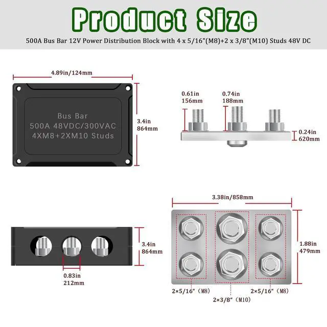 Plate Thickness: 0.24 / 6.2MM the maximum current: 500A, the battery distribution board can be at the maximum voltage of 300V AC or 48V DC ^^