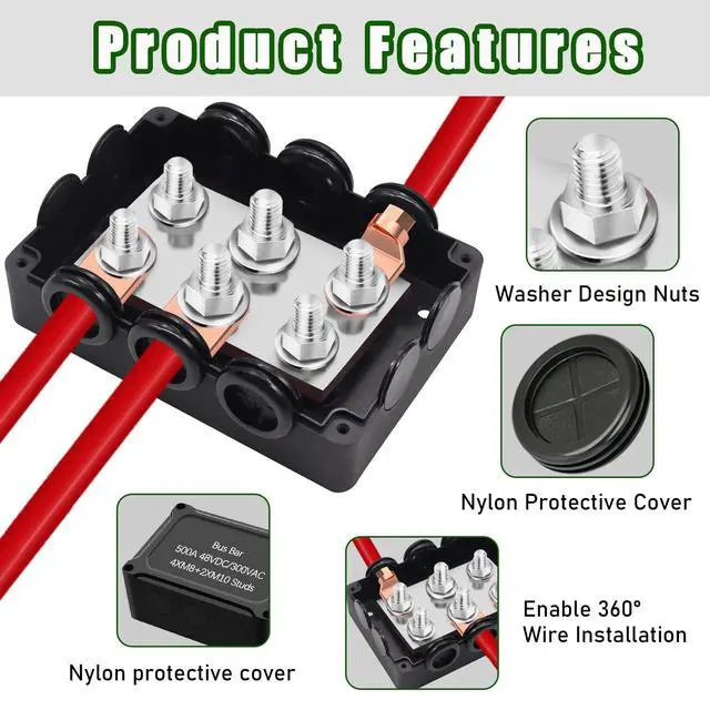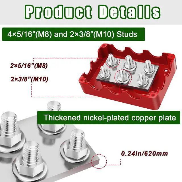 Material: PC material protective shell are used, The bus conductor is composed of copper bottom plate and stainless steel screw terminal, Copper Nickel Plated Plate with Stainless Steel Studs and Nuts. Red Positive Busbar and Black Negative (Ground) Busbar as a pair. which has good conductivity and corrosion resistance ^^