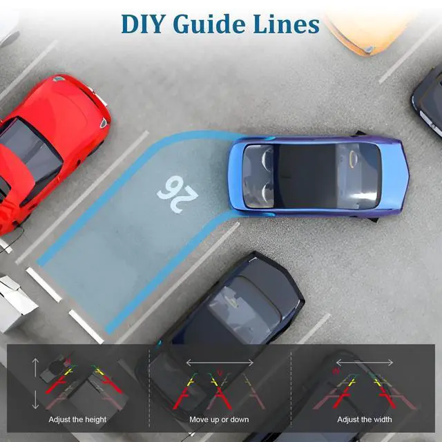 you can adjust the width of the parking line, move it left/right/up/down for fast and accurate reversing or parking, Also with adjustable brightness, contrast, saturation, tint and language for a perfect viewing experience. ^^ Night Vision CameraThe rearview camera has built-in 7 white LEDs can automatically switch to night vision function according to the light intensity, providing high-definition 2K resolution color images, whether day or night. When driving at night or in low-light areas such as parking lots and tunnels, providing a clear view for reversing or driving at night.