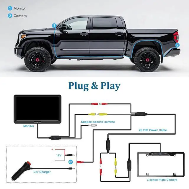 1080P Clear IamgeThe 7-inch high-resolution monitor reflects real-time images, maintains the original colors, and adopts advanced optical design and excellent image processing technology to provide your vehicle with 1080P resolution images. It is specially designed for cars, pickups, SUVs, RVs, minivans, sedans, etc. ^^ Support AHD and CVBS CamerasThe backup camera monitor is compatible with a wide range of AHD and CVBS cameras, connecting the second camera to the monitor's power supply (the white RCA female connector) via AV cable or RCA video cable. ^^ 2 Channels Prioritize safety with the dual-camera system, Minimize blind spots, customize guidelines, and tailor your driving experience to perfection.