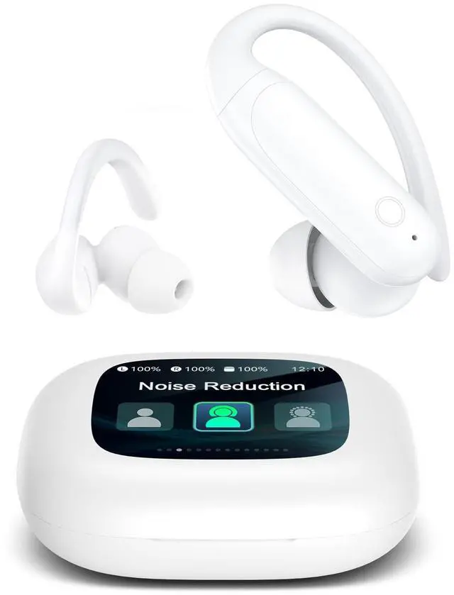 REVOLUTIONARY TOUCHSCREEN CHARGING CASE Experience next-level convenience with the TP03 wireless earbuds. The smart charging case features a responsive touchscreen that lets you play music, adjust volume, switch between ANC/Transparency modes, toggle 5 EQ presets (Normal/Rock/Classic/Pop/Jazz), and even trigger your phones camera remotely for perfect hands-free shots. Customize the screen with 5 preset wallpapers, or use the Find My Earbud feature on the intuitive 16-language interface to make misplaced earbuds beep. Everything you need is right at your fingertips. ^^ SECURE, WATERPROOF FIT FOR ANY WORKOUT Designed for intense sports, each of these ear buds features a flexible over-ear hook that stays securely in place during running, training, and gym sessions.