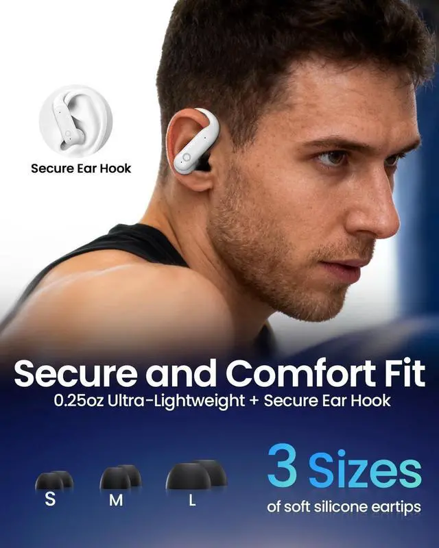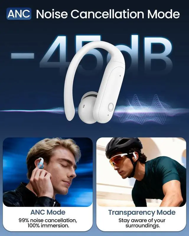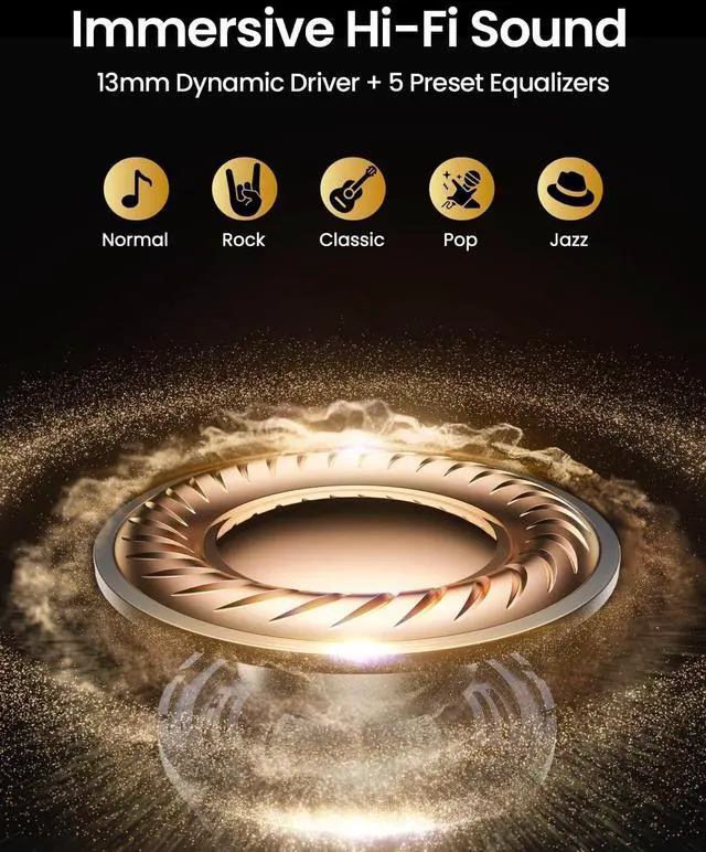 Weighing just 7.1 g ( 0.25 oz), they feel incredibly light. With IPX7 waterproof protection against sweat and rain, and three included silicone ear tip sizes (S/M/L) for a perfect seal, you get unwavering stability and all-weather confidenceno slipping, no distractions. ^^ PREMIUM HI-FI SOUND & SMART NOISE CONTROL Immerse yourself in exceptional audio powered by a large 13mm dynamic driver delivering deep bass and crisp highs. Choose from 5 preset EQ modes Normal, Rock, Classic, Pop, or Jazz to match your listening style. Seamlessly switch between Active Noise Cancellation (ANC) for full focus and Transparency Mode for situational awareness, via the touchscreen case or simple triple-tap controls.