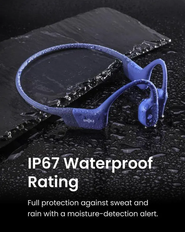 Open-Ear Comfort - OpenRuns innovative design features a featherweight, wraparound frame and wireless, open-ear fit for comfortable, earbud-free listening. Includes Shokz headband. ^^ Safety & Connection - Stay aware and motivated through any workout with our 8th generation bone conduction technology. OpenRun delivers quality audio while leaving your eardrums open to surroundings for ultimate safety. ^^ IP67 Waterproof Rated - A rugged, sweat-resistant design built to withstand your most intense workouts. Completely sweat and waterproof for workouts, fitness and running. Moisture detection alert included for safe charging. (Not suitable for swimming.
