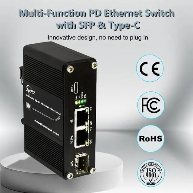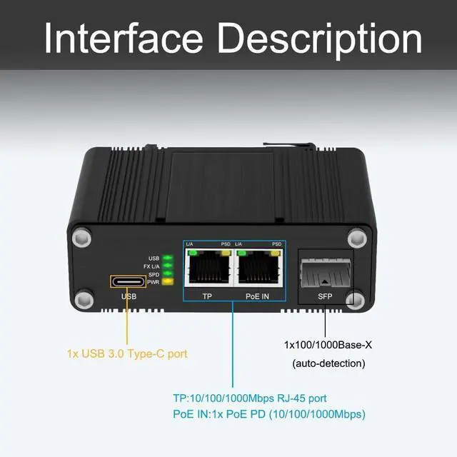 Bonus: Transfer data at 5Gbps with the USB 3.0 Type-C port. ^^ Industrial Durability & SafetyBuilt to withstand harsh environments with a heavy-duty metal casing, operating in -20C to 60C temperatures. Resists dust, vibrations, and extreme conditions in factories, warehouses, or outdoor CCTV setups. Certified for FCC/CE/RoHS compliance. ^^ Versatile All-in-One Hub Power robots, sync sensor data, charge tablets, and run PoE devices simultaneously. Supports fast-charging phones, drones, NVRs, and fiber modulesthe ultimate industrial & commercial networking powerhouse.