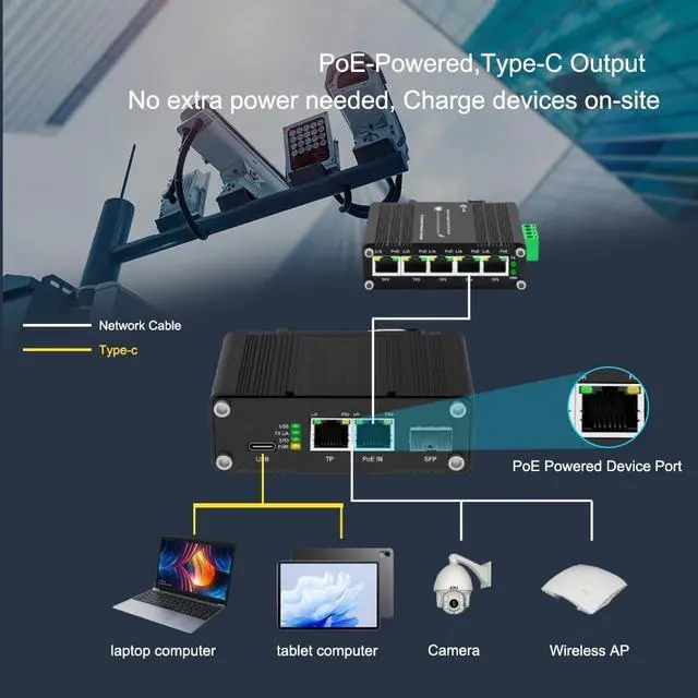 Dual-Power FlexibilityPower your devices your way with PoE IN ( 802.3 af/at) or DC 12-48V input options. Eliminate wiring hassles by running the switch via Ethernet from a remote PSE device or direct power supply. Ideal for rooftop security cameras, solar-powered robotics, and off-grid installations. ^^ 60W USB-C PD Fast ChargingCharge laptops, tablets, and phones at blazing speeds with the USB-C PD 3.0 port (5V-20V/3A, 60W max). Power IP cameras while charging a MacBook Pro or reboot a frozen NVR without downtimeall through a single device. ^^ Hybrid Connectivity for Future-Proof NetworksEquipped with 2x Gigabit Ethernet ports (10/100/1000M) and 1x SFP fiber slot (100/1000M).