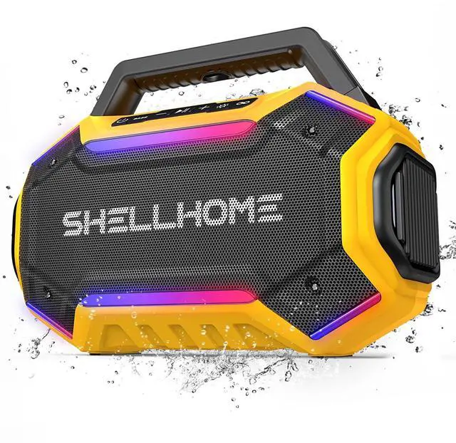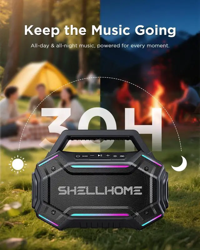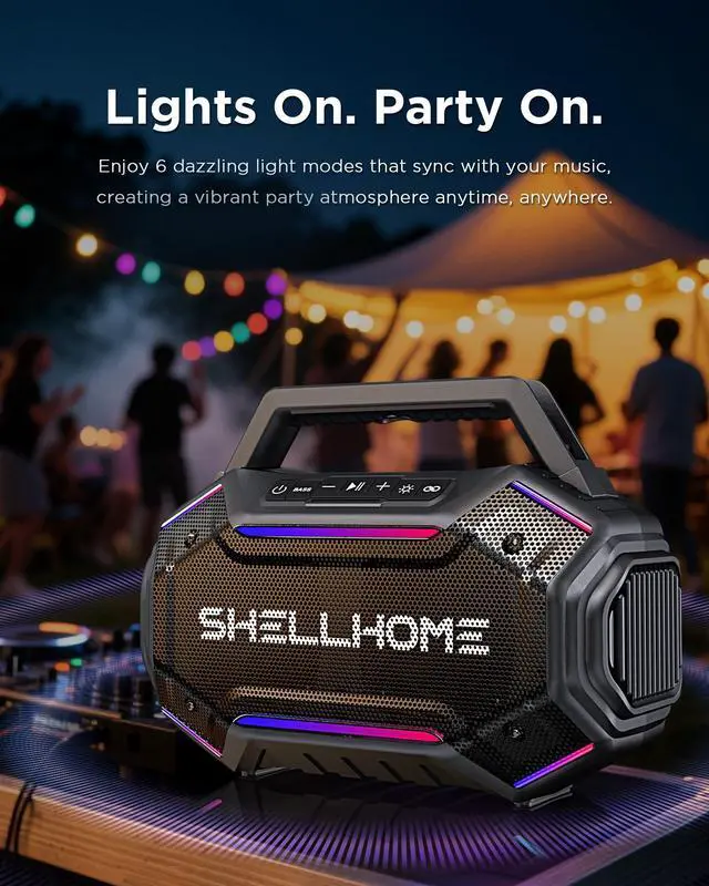 ^^ 30H Long-Lasting Playtime The buletooth outdoor speaker fully charged in just 4 hours, the portable wireless speaker delivers up to 30 hours of continuous playtime. With a built-in power bank, it also keeps your devices charged so you can enjoy music all day without worries. ^^ TWS & Bluetooth 6.0 SHELLHOME party bluetooth speakers equipped with advanced Bluetooth 6.0 technology for faster pairing and more stable connections. Pair two speakers via TWS mode to create true stereo sound for a more immersive listening experience.