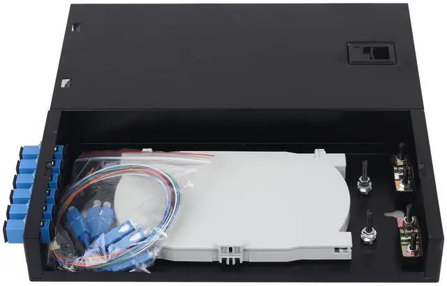 6 Simplex SC-UPC KitWall Mount Fiber Enclosure with Spool 6 Strands 1.2m SC Pigtail, Fiber Type 0.9mm 9/125 SingleMode G.625D; The snap on design allows for quick installation and maintenance. No need to tighten screws.