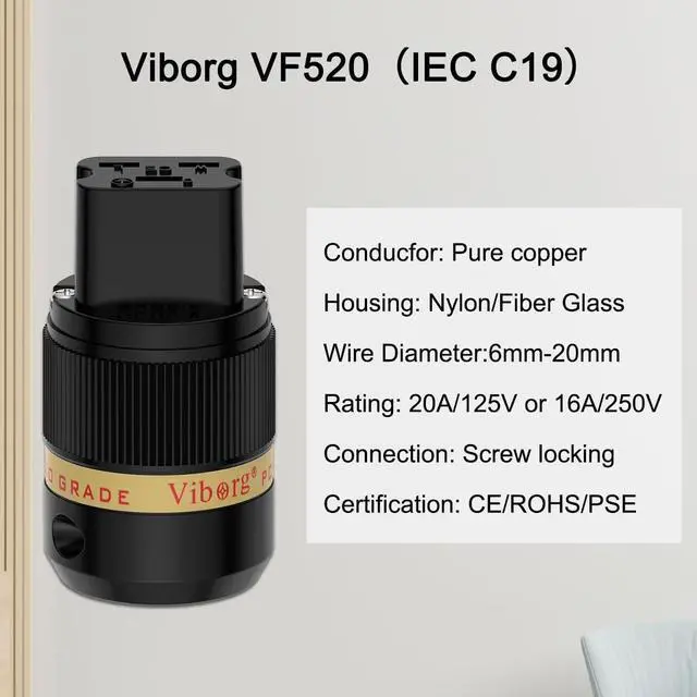 Pure Copper Conductivity- The Viborg VF520 C19 HiFi Power Connector is crafted from Pure Copper, ensuring optimal conductivity and minimal signal loss for a pure, unadulterated audio experience. Its dimensions of 50mm H x 33mm and over length of 69mm/2.7 provide a sturdy and reliable connection.