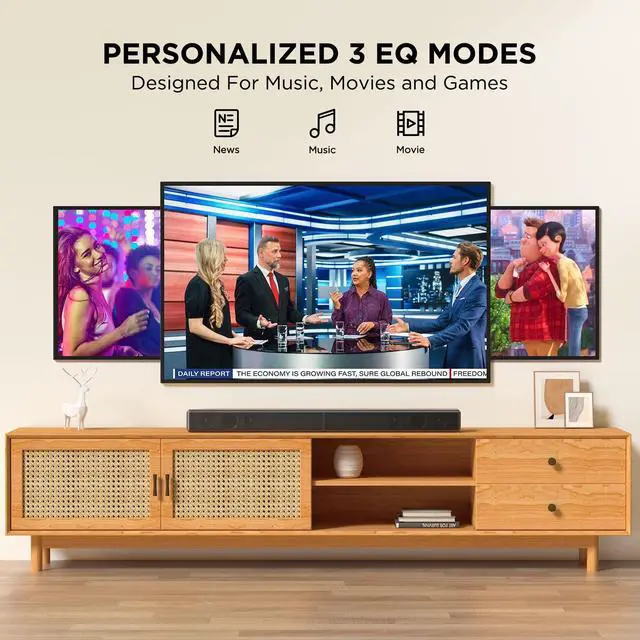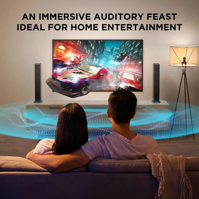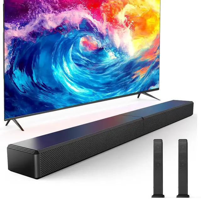 100W 2.0 ch Cinema Sound Dual tweeters and dual woofers deliver rich stereo or add an external subwoofer (sold separately) for enhanced bass. ^^ 2-in-1 Detachable Design & Space-SaverCan be combined into one unit for use, or divided into two units, which can be flexibly placed to save space ^^ 3 EQ Modes & DSP Noise Cancellation: Optimize audio for Music/Movie/Gaming. DSP chip removes distortion for crisp dialogue and detailed effects ^^ HDMI-ARC + Bluetooth 5.3 for
