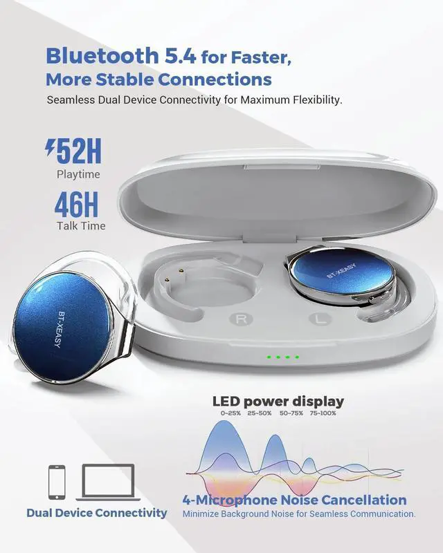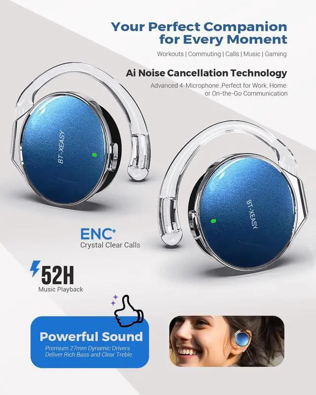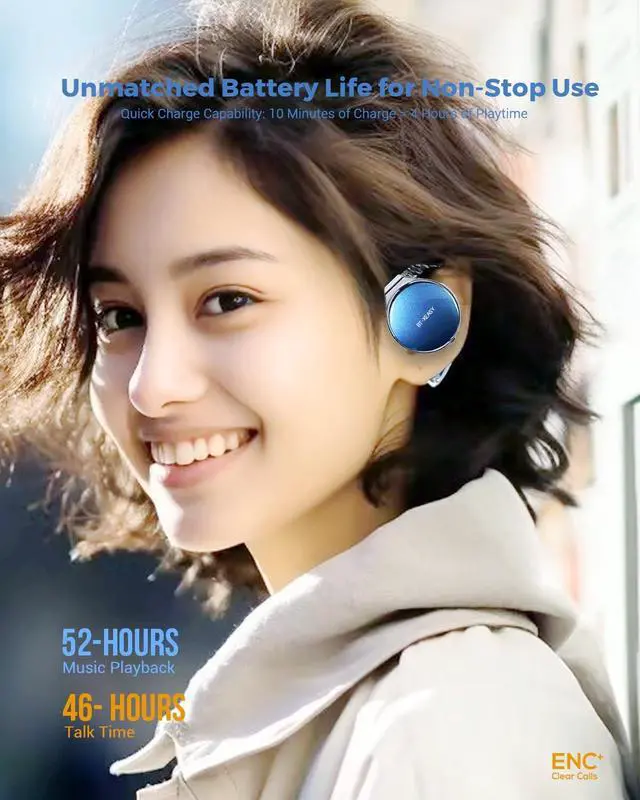 HD Stereo Audio & One Button ControlBT-X Easy Wireless on ear Bluetooth Headphones feature 27mm speakers for bass, By adopting a Bluetooth chip with ANC+ENC adaptive noise reduction function, the call noise suppression is clearer and the voice reproduction is higher. Music and phone calls can be easily controlled via the multifunction buttons on each headset. ^^ Listen to music for up to 18 hoursThe open-ear wireless headphones can listen to music for up to 18 hours with a single full charge. When the charging case is fully charged, the sport Bluetooth headsets total listening time of music can be up to 52 hours.
