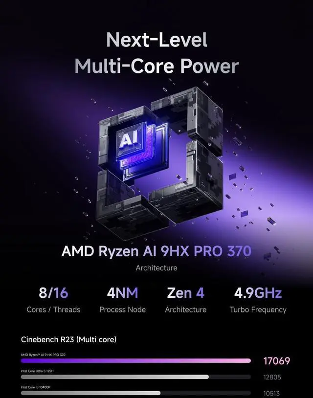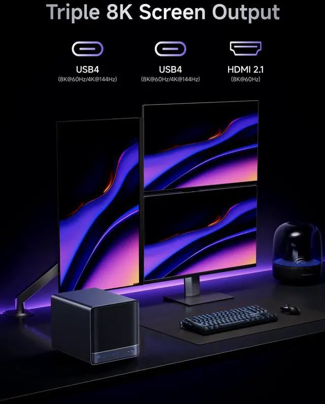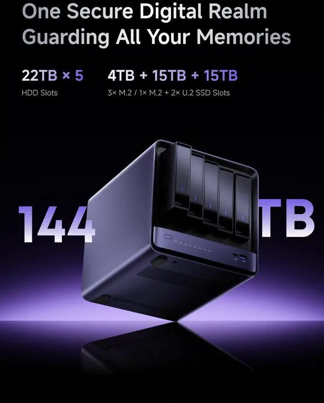 Leading NAS PowerhouseThe MINISFORUM AI NAS is powered by the AMD Ryzen 7 255 processor, featuring AMD's cutting-edge Zen 5 architecture. With 8 cores and 16 threads, it reaches a boost clock speed of up to 4.9GH z. AMD Ryzen AI enhances productivity, facilitates advanced collaboration, and boosts operational efficiency. ^^ The Ultimate DIY NAS SolutionThe MINISFORUM N5 Air NAS supports a colossal 144TB storage capacity, offering unparalleled configuration flexibility. It features five HDD slots (each supporting up to 22TB), three M. 2 slots, and one M.