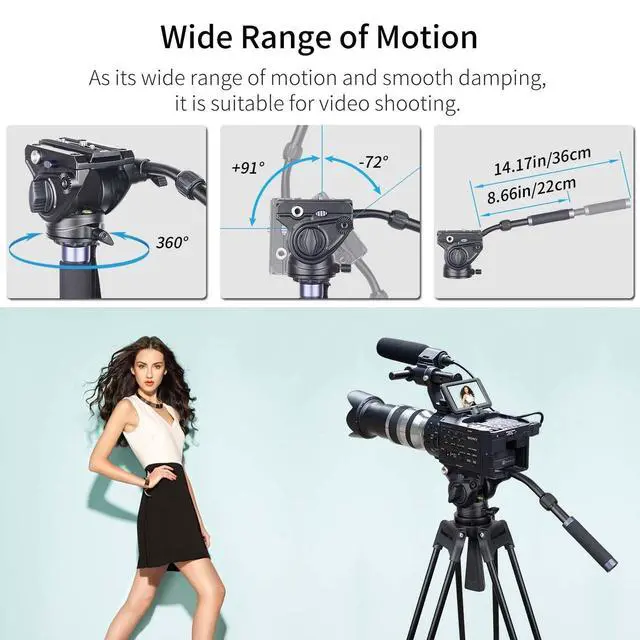 Excellent QualityThis professional fluid video head is made of high quality aluminum alloy, manufactured by precision CNC and casting technologies, max load is 24.5 lb/12kg, it is perfectly compatible with most big professional tripods and monopods, it is a good partner for big camera and lens. ^^ Wide Range of Motion This video head is suitable for video shooting as its wide range of motion and smooth damping. It can be rotated 360 degrees smoothly on horizontal, the tilt range is -72to 91and the lock is firm, so that you can take photos whatever you want.