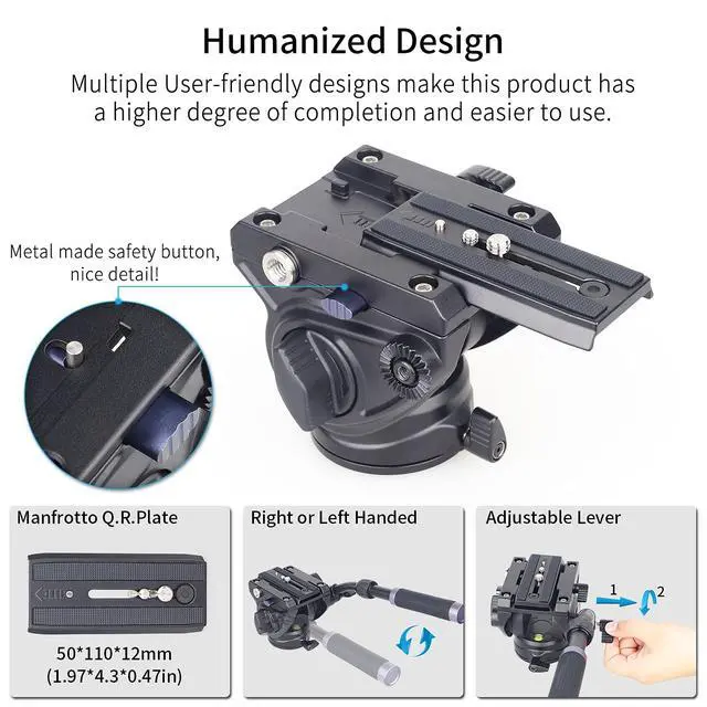 ^^ 2-section Adjustable HandleThis video heads handle adopts 2-section structure, the length can be adjusted between 22cm to 36cm, suitable for more requirements. ^^ Humanized Detail Design Multiple User-friendly designs make this video head has a higher degree of completion and easier to use. ^^ Universal Q. R. Plate This is a universal quick release plate, this video head is compatible with Manfrotto series quick release plate and it is very convenient to remove the quick release plate.