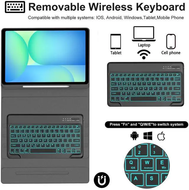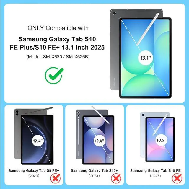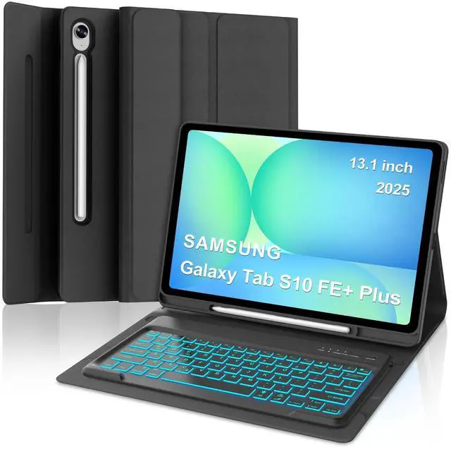COMPATIBLESamsung Wireless keyboard case compatible with Galaxy Tab S10FE+ Plus 13.1 inch 2025 released (Model: SM-X620/X626B), Please confirm the model number before purchase. Samsung Tablet or S-Pen NOT INCLUDED. You can check the model number before purchasing to make sure you get the correct size tablet keyboard case. ^^ Magnetically Detachable KeyboardThis ultra-thin and lightweight magnetic keyboard for Galaxy Tab S10 FE Plus 13.1 inch can be firmly attached to the case, which helps the tablet stand upright and turn it into a laptop in less than a second. Equipped with useful shortcut keys and compatible with Android, IOS and Windows systems, provide you with ultimate convenience. ^^ Adjustable 7 Colors Backlit Keyboard This for Samsung Tab 13.1 inch keyboard case is designed with laser-etched backlit keys that allow 7 vibrant colors to shine in the dark, illuminated typing is more fun and easy. You can choose your favorite color, bringing you different visual enjoyment. Ergonomic and mechanical scissor keys with rebound feature to reduce noise, enjoy comfortable typing even long hours ^^ Rechargeable and Long Battery Life Our for iPad case with keyboard built-in 500mAh large capacity battery, more energy saving and lower consumption, ensure you can use at least 75 hours.