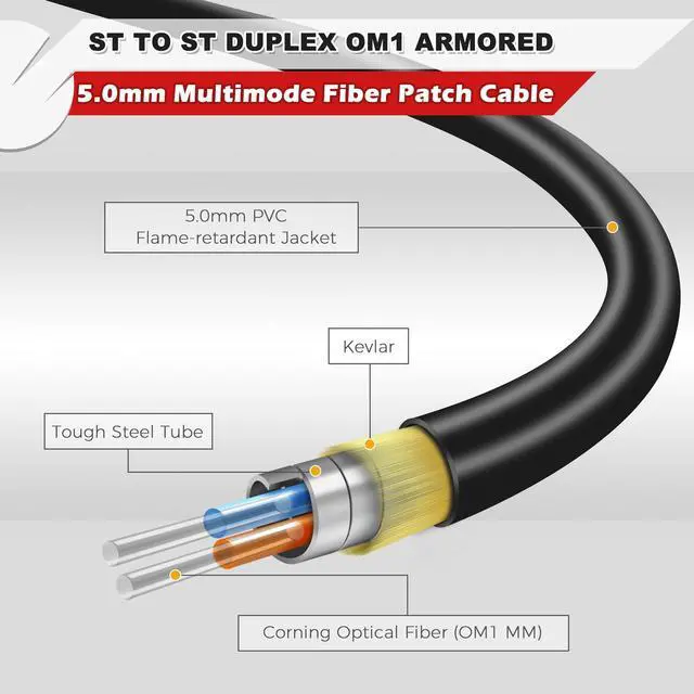 Yunsufiberpro 30ft / 10m Outdoor Armored OD-5mm OM1 ST to ST Fiber Cable, Multimode Duplex 62.5/125 MMF, ST-ST Fiber Optic Patch Cable