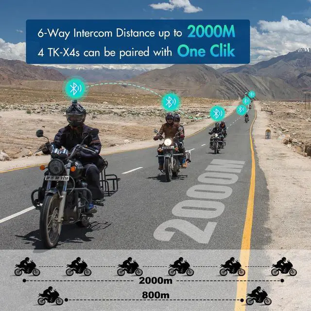 6-Person Group Intercom & Music SharingTK-X4 motorcycle Bluetooth headset can connect up to 6 TK-X4 or X4SC units (Optimal for 4 units) and their communication distance is up to 2 kilometers, keeping you connected with your group during your motorcycle ride. The maximum communication distance is 800 m in two-way intercom. It also featured music sharing, allowing two riders to enjoy the same song simultaneously during their journey. ^^ Powerful Noise Cancellation & AptX Audio Technology With advanced DSP and CVC noise reduction technology and AptX high audio coding technology of Bluetooth 5.4, which provide powerful noise cancellation, Hi-Fi stereo sound quality and low Latency for the audio from TK-X4 Bluetooth headset, built-in 40mm speakers deliver clear and crisp sound quality even when riding at high speeds.