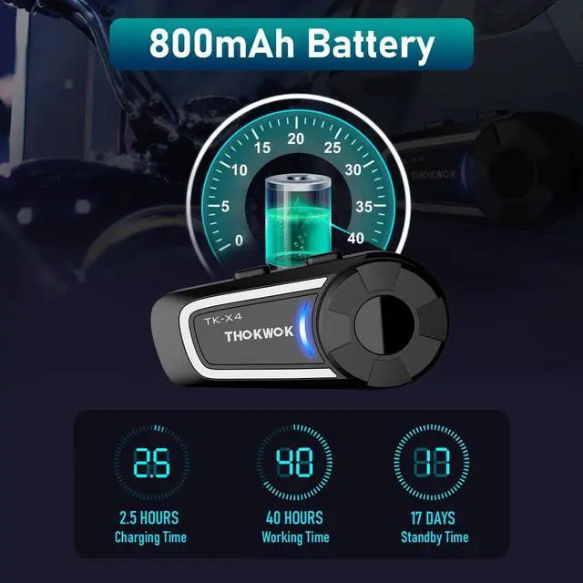 And the built-in 800mAh battery provides up to 40 hours of music or intercom and up to 500 hours of standby time, you can enjoy long days of driving without interruption. ^^ IP67 Waterproof Design & Universal PairingIt is waterproof, dustproof and shockproof to handle all weather conditions, making it perfect for outdoor adventures. Universal pairing function, can pair not only with THOKWOK Bluetooth headsets such as TK-X4SC, TK-X2, BT-S3, but also with most other Bluetooth headsets on the market.