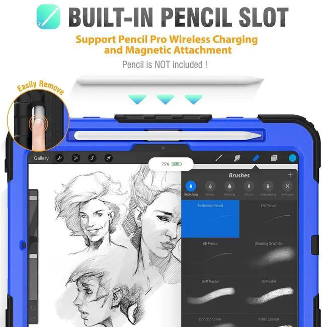 ^^ Pencil Holder & Precise Cut-outs -- Allow easy access to all ports and buttons, the Pencil Slot Holder supports pencil 2nd wireless charge and magnetic attachment, always keep your pencil secure in place, free take the Pro11 m5 m4 case around or put it in to a bag.