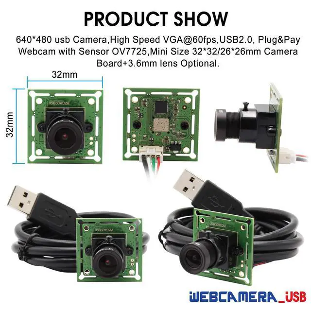 Camera Module: Webcamera_usb Usb camera module with 3.6 mm wide angle lens, 0.3MP VGA usb camera can meet most capturing and video requirements, 480p camera module with cmos ov7725 image sensor, Equipped with 1 meter usb cable, Support otg. ELP 100% brand new and high quality VGA USB Camera Module Mini Camera Board, a tiny module based on OV7725 chip, High pixel technology, clear images and accurate color reproduction. ^^ ELP High Speed USB 2.0 480P