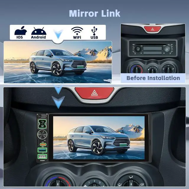 MirrorLink]: The single din capacitive touchscreen radio has been upgraded to 1280x600 Full HD for a crisp viewing experience. It also supports IOS/Android MirrorLink, allowing you to mirror your cell phone screen on the radio's display and use mobile apps, music, videos and more ^^ [Equipped with