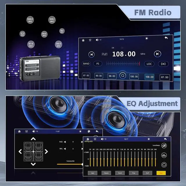 FM/EQ Functions]: Single din carplay radio with high-quality stereo, which can search channels in full-automatic ways, semiautomatic way and acurate adjustment wayListen to music, newsletters and traffic information anytime, anywhere. The EQ sound effect function allows you to adjust the equalizer settings of the audio output for better sound quality ^^ [Multi-function Interface & 12 Colorful
