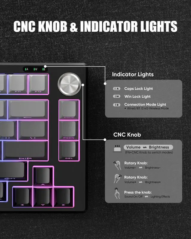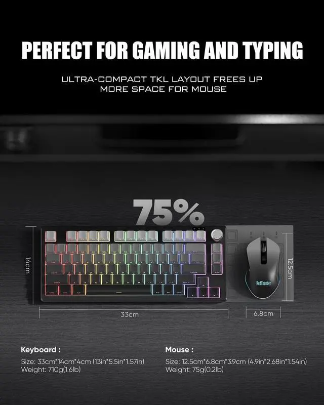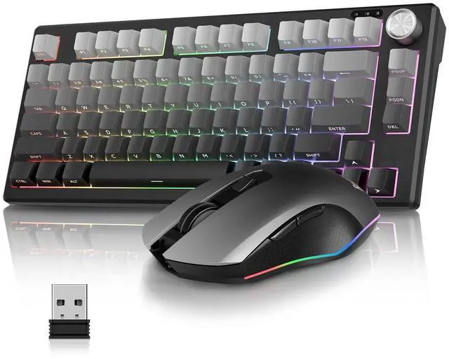 Note: The keyboard and mouse share a single USB receiver, which is located at the bottom of the keyboard or mouse. ^^ 75% Compact Layout & Side-Engraved Character Design80-key side-engraved keyboard with 1 multi-function CNC knob saves 25% desktop space vs full-size keyboard; side-engraved characters wear-resistant and non-fading, clear visual effect even in dark gaming environment. Equipped with a premium CNC metal knoblong press FN + Knpb for 3s to switch between volume and lighting modes, rotate to adjust volume/backlight brightness, press to mute or cycle RGB lighting effects. The membrane key is quiet and comfortable, providing good tactile feedback. ^^ Rechargeable Wireless Keyboard and Mouse4000mAh high-capacity keyboard battery (5-6h charging time) + 800mAh mouse battery (1-2h charging time); keyboard auto-standby in 2min/sleep in 15min, mouse auto-standby in 1min/sleep in 15min, low power consumption design. Red slow flash of keyboard connection light & mouse delay/light off prompt low battery. Please use original Type-C cable to charge via computer USB for 8 hours before using. ^^ Light Up Keyboard and MouseThe K75 gaming keyboard can adjust RGB backlighting through multiple shortcuts (brightness/speed/effects optional), and FN + ESC restores factory settings.